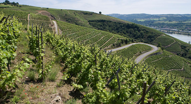 在北羅納河谷(Northern Rhone Valley),獨特的地形和氣候條件鑄就了風格極為強勁的西拉葡萄酒。這里緯度較高,且常年有密斯托拉風(Mistral)吹拂,氣候十分涼爽,是西拉葡萄可以達到完全成熟的臨界環(huán)境。正是在這樣的環(huán)境下,西拉的品種魅力被完全激發(fā)出來。葡萄園大多坐落在東西走向的山谷地帶,以降低從北方吹來的密斯托拉風的影響,且多分布于朝南向的陡峭山坡上,有利于葡萄樹接收充足的陽光和熱量。