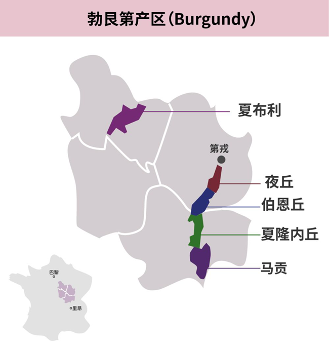 高品質(zhì)的霞多麗分布于夏布利、伯恩丘和馬貢等產(chǎn)區(qū),由于霞多麗的適應(yīng)性強(qiáng),依據(jù)產(chǎn)區(qū)不同,霞多麗的風(fēng)格十分多變。北部夏布利氣候涼爽,出產(chǎn)的霞多麗酒體清瘦,酸度較高。中部伯恩丘氣候溫和,匯集著夏山-蒙哈榭(Chassagne-Montrachet)、普里尼-蒙哈榭(Puligny-Montrachet)和默爾索(Meursault)等重量級(jí)優(yōu)質(zhì)村莊級(jí)產(chǎn)區(qū),出產(chǎn)的霞多麗以酒體復(fù)雜飽滿(mǎn)和極具表現(xiàn)力而著稱(chēng)。南部馬貢氣候溫暖,其知名度最高的子產(chǎn)區(qū)——普伊-富賽(Pouilly-Fuisse)出產(chǎn)的霞多麗香氣多樣,酒體更為飽滿(mǎn),常常表現(xiàn)出明顯的橡木特征。