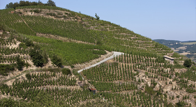 在北羅納河谷葡萄園,河流流經(jīng)之處多為狹窄的峽谷和陡峭的山坡,因此葡萄園也更多地種植在靠近河流的陡坡上。由于離海洋較遠(yuǎn),北羅納河谷葡萄園以大陸性氣候?yàn)橹?,但又多多少少?huì)受到地中海(Mediterranean)氣候的影響,夏季炎熱干燥,冬季寒冷少雨。這里的土壤以礫石、頁巖和石灰?guī)r為主,排水性能優(yōu)越。這樣一來,種植在山坡上的葡萄藤可以更好地接收生長(zhǎng)季充足的陽光,再加上排水性良好的土壤,有助于葡萄果實(shí)更好地成熟。北羅納河谷葡萄園著名的子產(chǎn)區(qū)羅第丘(Cote Rotie)的產(chǎn)區(qū)名在法語中意為“被炙烤的山坡”,就很形象地描繪了這一風(fēng)土特點(diǎn)。