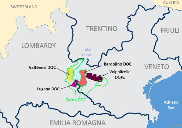 隸屬于威尼托大區(qū)維羅納省的巴多利諾(Bardolinoi)市,距離維羅納市西北約25公里,距離威尼斯以西約130公里,處于加爾達(dá)湖(Garda)東岸,北靠阿迪杰山谷(valle dell’Adig),西至明喬河(Il Mincio )。巴多利諾的中南部地區(qū)有一系列狹長的山丘,地區(qū)海拔差異在50-100米之內(nèi),部分洼地中分布有泥炭沼澤。