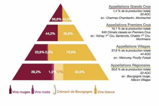 與波爾多完全不同的是,勃艮第并不是以酒莊為分級方法,而是以土地的位置為來進行,表現(xiàn)如金字塔般垂直走向的方式,以原產(chǎn)地為命名系統(tǒng)(AOC)建立形成,井然有序的分級制度一直保存至今。