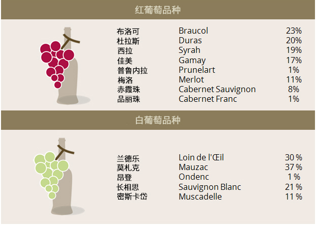 加亞克產(chǎn)區(qū)使用的法定葡萄品種共有13種,其中紅葡萄品種有8種:布洛可(Braucol)、杜拉斯(Duras)、西拉(Syrah)、佳美(Gamay)、普魯內(nèi)拉(Prunelart)、梅洛(Merlot)、赤霞珠(Cabernet Sauvignon)和品麗珠(Cabernet Franc),而白葡萄品種則共有5種:蘭德樂(lè)(Len de l'El/Loin de L’Oeil )、莫札克(Mauzac)、昂登(Ondenc)、長(zhǎng)相思(Sauvignon Blanc)和密斯卡岱(Muscadelle)。
