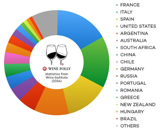 世界三大葡萄酒生產(chǎn)國是法國,意大利,西班牙。這三個國家?guī)缀跎a(chǎn)了世上一半的葡萄酒,足夠填滿5127個奧運會大小的游泳池。