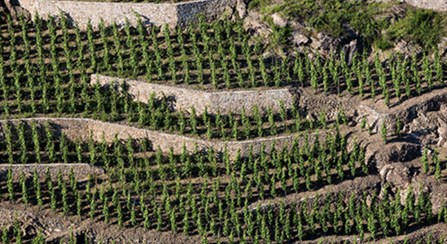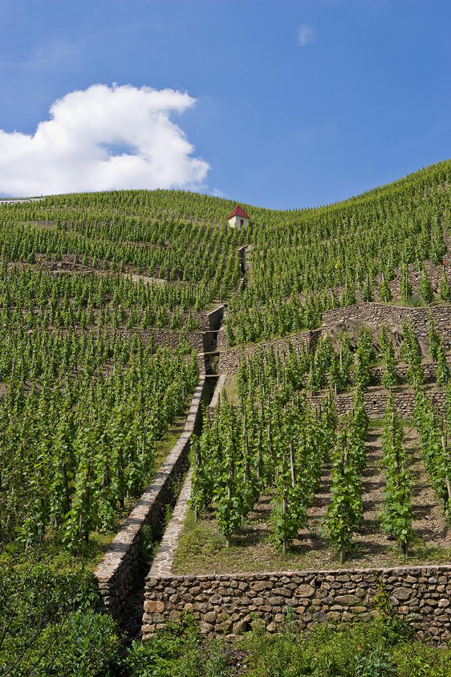 羅第丘地勢(shì)陡峭,有些山坡的坡度可達(dá)60度。為了蓄水保土,人們建造了被當(dāng)?shù)厝朔Q為“cheys”的石墻,它們經(jīng)年累月地佇立在羅第丘,見證了歲月變遷和人事變換,有些石墻的建造甚至可追溯至羅馬時(shí)期。經(jīng)過人類兩千多年的“雕刻”,這些石墻使羅第丘形成了狀似梯田的壯麗景觀。