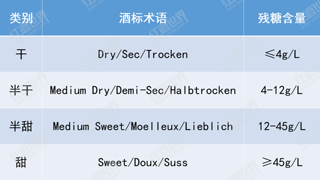 人們根據(jù)殘?zhí)呛繉⑵咸丫品譃榱税ǜ尚驮趦?nèi)的幾個(gè)類別,具體可參照下表。需要注意的是,“干型”葡萄酒并不是完全不含糖,只是含糖量較低,無(wú)法被人所感知而已。