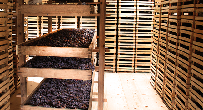 常見的風(fēng)干工藝之一是將果實留在葡萄藤上進(jìn)行自然風(fēng)干,待葡萄在藤上變干、糖分得到高度濃縮之后再采收,用于釀造甜酒。此種工藝對天氣條件有特定的要求,葡萄必須在溫暖干燥的秋季才能風(fēng)干,否則會容易感染灰霉菌。在法國蘇玳(Sauternes)產(chǎn)區(qū),倘若葡萄沒有成功感染貴腐菌,一些酒莊便會采用此方法幫助葡萄濃縮糖分,釀造出風(fēng)味濃郁、口感美妙的甜酒。用這種方式釀造出的葡萄酒有時會在酒標(biāo)上標(biāo)注“晚采收(Late Harvest)”。另外,也可將采摘后的葡萄鋪在草席上于室外曬干,又或者把葡萄放置于干燥通風(fēng)的屋子中風(fēng)干〔此風(fēng)干工藝在意大利瓦坡里切拉(Valpolicella)產(chǎn)區(qū)廣泛使用,在當(dāng)?shù)乇环Q作“枯藤法”(Appassimento)〕。風(fēng)干后的葡萄流失了大量水分,果實中的糖分和風(fēng)味物質(zhì)得以濃縮,因此釀成的葡萄酒擁有飽滿的酒體和較高的酒精度,風(fēng)味也十分濃郁。