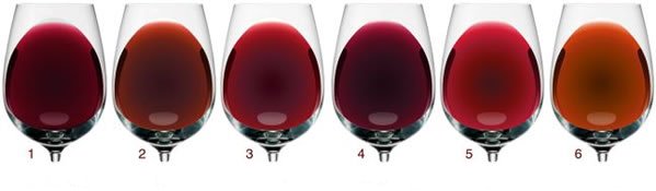 不同的葡萄品種由于葡萄皮的厚薄不一,所以帶給紅葡萄酒的顏色也不一樣。而且因?yàn)槊绹鞍闹薜鹊厝照諘r(shí)間較長,葡萄皮普遍因此曬得變厚,故此顏色也較法國、意大利等地方深。綜合來說,以最普遍的年輕葡萄品種比較,赤霞珠(Cabernet Sauvignon)偏向圖(1),美樂(Merlot)偏向圖(3), 西拉(Syrah/Shiraz偏向圖(4)及黑皮諾(Pinot Noir) 偏向圖(5)。