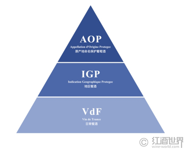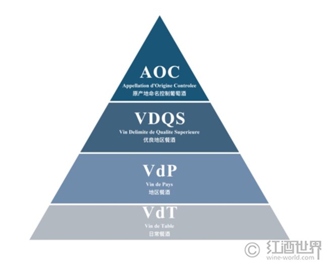 在該分級體系中,法國葡萄酒從高到低被劃分成原產(chǎn)地命名控制葡萄酒(AOC)、地區(qū)餐酒(Vin de Pays/VdP)和日常餐酒(Vin de Table/VdT)三個等級,而后又于1949年在AOC與VdP之間新增了優(yōu)良地區(qū)餐酒(Vin Delimite de Qualite Superieure/VDQS)這一級別。