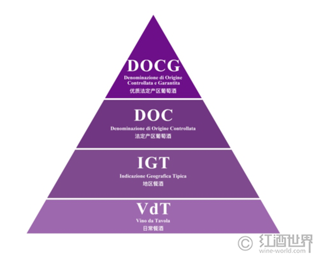 上世紀(jì)60年代之前,意大利尚沒有確立行之有效的葡萄酒分級制度,消費者難以在種類繁多的意大利葡萄酒中甄別出優(yōu)質(zhì)佳釀,這很大程度上阻礙了意大利葡萄酒在國際市場上的發(fā)展。于是從1963年開始,意大利便逐步建立并完善其葡萄酒分級體系,把葡萄酒劃分為4個品質(zhì)級別。