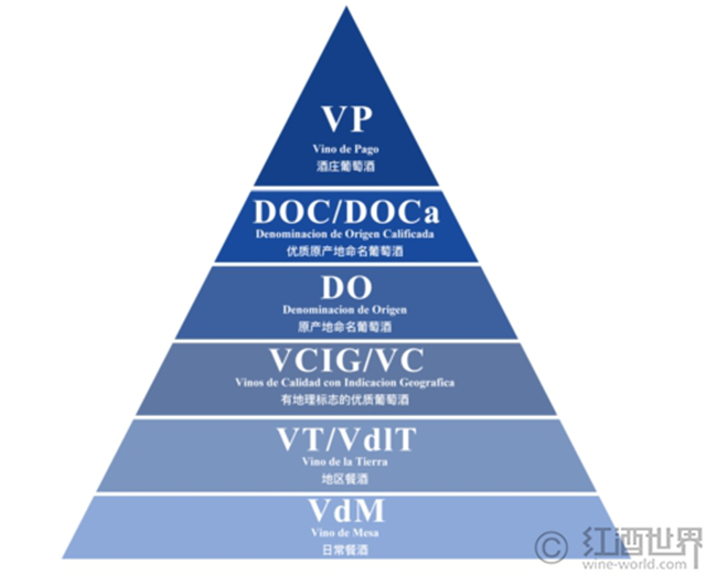 西班牙在20世紀(jì)30年代初期就擬定了原產(chǎn)地命名制度(Denominacion de Origen,簡稱DO),但直到70年代才正式頒布實施。傳統(tǒng)的西班牙葡萄酒分級體系和法國的等級劃分大有不同,不過自2003年改革后,其框架已越來越接近于法國的分級體系。西班牙的葡萄酒分級包含以下6個級別: