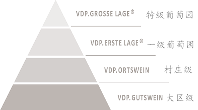除此之外,由德國頂尖酒莊組成的德國名莊聯(lián)盟(Verband Deutscher Pradikatsweinguter,簡稱VDP)也推出了適用于成員酒莊的分級體系。與官方的分級制度不同,該體系依據(jù)葡萄園的質(zhì)量和風(fēng)土特點、葡萄種植技術(shù)及年份品質(zhì),將葡萄園分為4個等級。