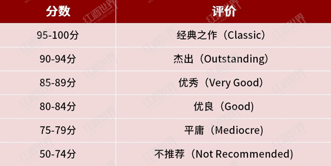 為了提升雜志的內容質量,WS在給新發(fā)布的酒款做品評的同時,也在不斷改進自己的評價機制。從修正版加州大學戴維斯分校九分制(Modified UC Davis Nine-point Scale)到歐洲二十分制,再到挑選出“觀者之選(Spectator Selections)”、“高性價比(Best Buys)”和“不推薦(Not Recommended)”酒款,WS對葡萄酒的評價機制幾經變換。1985年,WS決定采用百分制來評價葡萄酒并沿用至今。百分制以50分為起評分,將酒款劃分為六個等級: