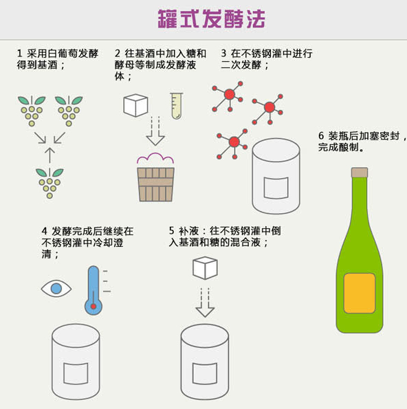 罐式發(fā)酵法最大的優(yōu)點就是成本低,耗時少,節(jié)省勞動力,目前世界上大多價格實惠的起泡酒都采用罐式發(fā)酵法釀制。這種起泡酒一般口感簡單,香氣明顯。不過,由于沒有進行酒渣陳釀,少了酵母帶來的復雜風味,因此嘗起來就像靜止葡萄酒中加入了氣泡一樣