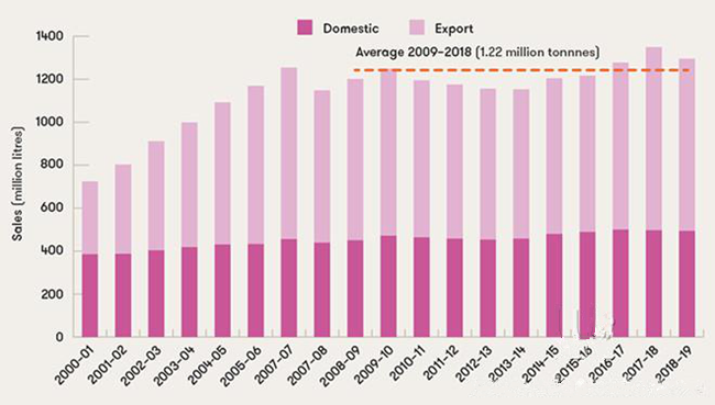 根據(jù)澳大利亞葡萄酒協(xié)會(Wine Australia)今天發(fā)布的《2019年葡萄酒生產(chǎn)銷售和庫存報告》顯示,澳洲葡萄酒總銷量連續(xù)第二年超過產(chǎn)量,這表明供應(yīng)趨緊并提升了澳大利亞葡萄酒行業(yè)的價值。