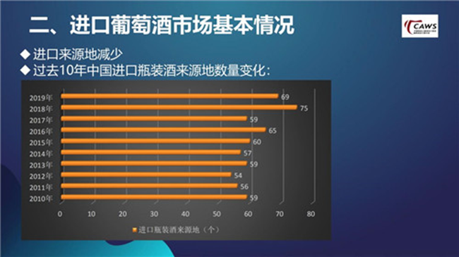 此外,進(jìn)口來源地減少,2019年瓶裝酒進(jìn)口來源地前十位約占進(jìn)口總額的96.0%。其中,又以澳大利亞葡萄酒的表現(xiàn)最為突出,在2019年以8個(gè)點(diǎn)的差距反超了法國葡萄酒,但在接下來的市場(chǎng)競(jìng)爭(zhēng)中,澳大利亞葡萄酒也面臨一定挑戰(zhàn):首先,零關(guān)稅、大品牌驅(qū)動(dòng)、投資移民等因素的推動(dòng)作用會(huì)在階段性變化中逐漸減弱,澳洲與法國在接下來的市場(chǎng)中差距不會(huì)進(jìn)一步拉大;其次,意大利、智利等國葡萄酒在中國市場(chǎng)競(jìng)爭(zhēng)愈加激烈化,近兩三年來,他們明顯加強(qiáng)了在中國市場(chǎng)的投入,處在一個(gè)比較穩(wěn)定的上升階段,我個(gè)人比較看好他們接下來的表現(xiàn)。