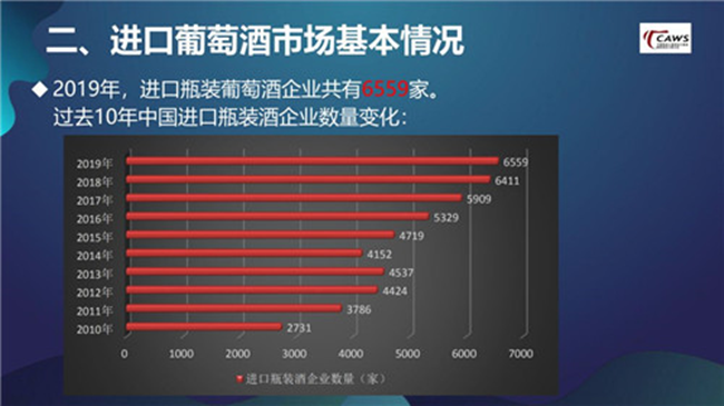 進(jìn)口瓶裝葡萄酒企業(yè)數(shù)量不斷增加,中小企業(yè)面臨挑戰(zhàn)。 從過去10年的數(shù)據(jù)來看,中國進(jìn)口瓶裝葡萄酒企業(yè)數(shù)量整體上是不斷增加的。2019年也不例外,進(jìn)口瓶裝葡萄酒企業(yè)共有6559家,比2018年增加了148家。產(chǎn)生這種情況的原因,我認(rèn)為有兩個(gè),一是葡萄酒的商品屬性,決定了它經(jīng)營上的分散化;二是中國葡萄酒企業(yè)自身韌性十足,在市場(chǎng)大調(diào)整時(shí)期仍在堅(jiān)持。