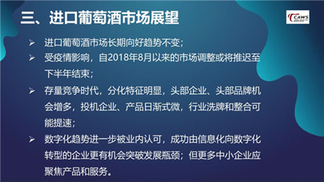 調(diào)整期被延長,進(jìn)口葡萄酒市場(chǎng)格局競(jìng)爭(zhēng)更為激烈。 需要注意的是,自2018年8月開始,中國葡萄酒市場(chǎng)進(jìn)入到調(diào)整期。由于受到2020年疫情的影響,整個(gè)調(diào)整期結(jié)束時(shí)間將被延長,至于何時(shí)能結(jié)束,與當(dāng)下疫情防控工作的進(jìn)展緊密相關(guān)。如果防控進(jìn)展較為理想,我認(rèn)為在今年下半年開始,市場(chǎng)將逐漸恢復(fù)。