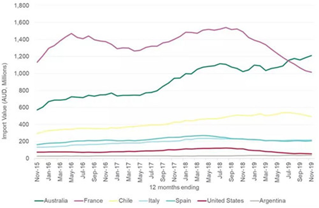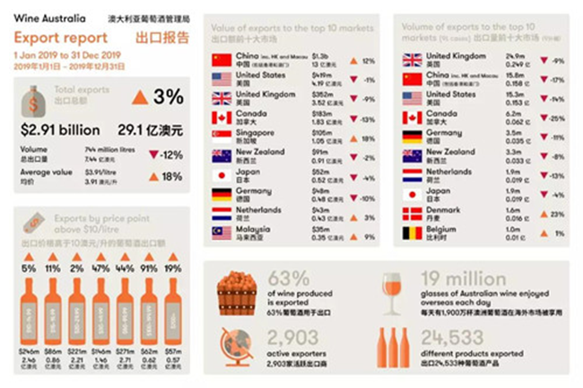 近日,澳大利亞葡萄酒管理局公布了最新出口報(bào)告。截至2019年12月底的12個(gè)月,澳大利亞葡萄酒對(duì)中國市場的出口總額及平均出口額雙雙創(chuàng)下年度新高。