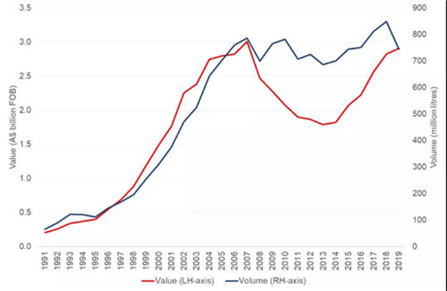隨著市場對(duì)精品澳大利亞葡萄酒的需求日益增長,截至2019年12月底的12個(gè)月中,澳大利亞葡萄酒的出口總額增長了3%至29.1億澳元。