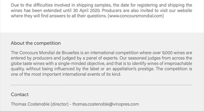 為了緩解因疫情而受到影響的國際樣品寄送,組委會也將2020年4月30日定為最終的樣品報名和寄送截止時間。