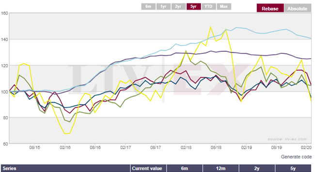 不論短期和長期(5年),行業(yè)基準的Liv-ex 100指數(shù)和最廣泛市場指標的Liv-ex 1000指數(shù)的表現(xiàn)均優(yōu)于全球股票(和石油!)。 在過去五年,Liv-ex 1000指數(shù)已上升了40%,而FTSE100指數(shù)卻下跌了5%。