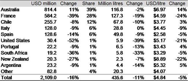 在此期間,澳大利亞葡萄酒對中國市場(包括香港和澳門)的出口額增長了 13%至 12.5 億澳元,出口量下滑 11%至 1.37 億升 (等量于 1520 萬箱 9 升裝)。平均出口額增長 27%至 9.11 澳元/升(離岸價)的創(chuàng)紀錄水平。