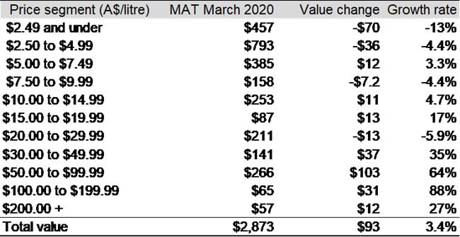 截至 2020 年 3 月底的 12 個月中,出口額最大的降幅主要出現(xiàn)在價格低于 5 澳元/升(離岸價)的澳大利亞葡萄酒。相反,價格高于 10 澳元/升(離岸價)的葡萄酒出口額則增長了 22%至 10.8 億澳元,特別是價格區(qū)間在 50 至 99.99 澳元之間的葡萄酒成為驅(qū)動澳大利亞葡萄酒出口額增長的主力軍。
