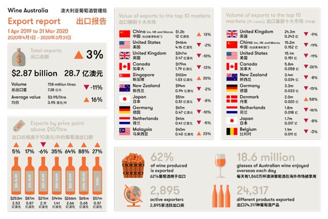 “澳大利亞葡萄酒在 2020 年 3 月對中國市場的出口額相比于 2019 年 3 月降低了 43%,而整個第一季度的出口額則相比于去年同期降低了 14%。縱觀全球,2020 年 1-3 月澳大利亞葡萄酒的出口總額相比于去年同期降低了 7%,這主要是受到中國大陸葡萄酒銷量降低的影響。”