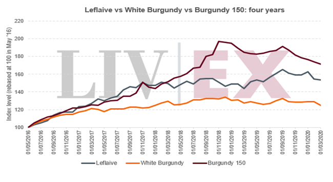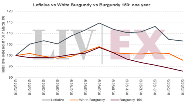 然而,在過去的一年,勒弗萊(6.5%)的表現(xiàn)也優(yōu)于勃艮第150(-7.2%)。 事實(shí)上,勃艮第150指數(shù)是表現(xiàn)最差的Liv-ex 1000分項(xiàng)指數(shù); 我們?cè)谧罱膶n}報(bào)告: 高峰后的勃艮第 中也探討了它的跌勢(shì)。