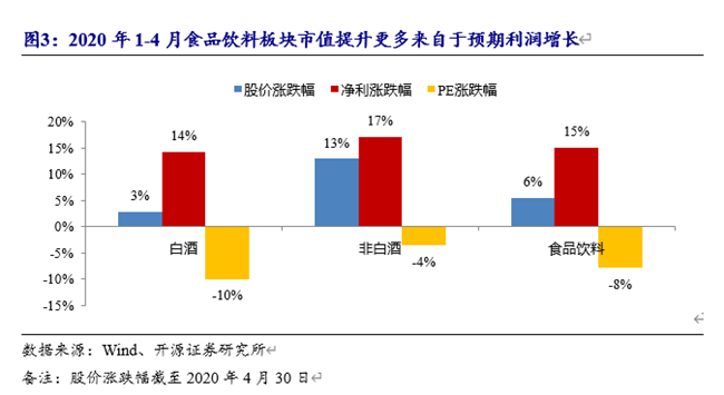 2020年1-4月食品飲料板塊上漲5.5%,在一級子行業(yè)中排名第三。漲幅分解來看,預(yù)計2020年凈利增長15%。