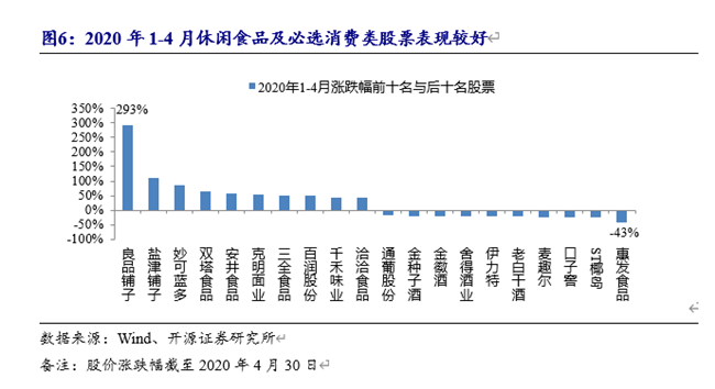 尤其是進(jìn)入2020年4月份以來,食品飲料板塊上漲9.4%,其中重要原因是:國內(nèi)疫情控制得當(dāng),消費回暖,以白酒為代表的可選消費重新獲得市場青睞,漲幅領(lǐng)跑各大品類,為13.8%,而葡萄酒銷售亦有上漲趨勢,為5.5%。
