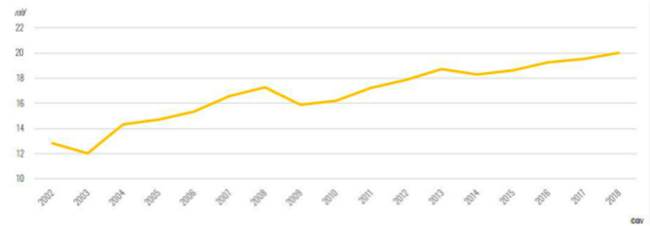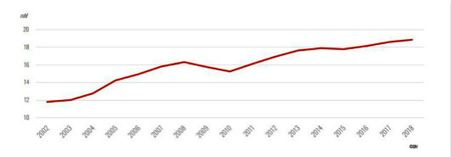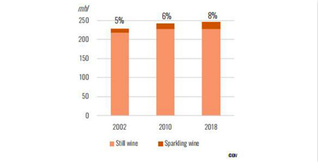 起泡葡萄酒占全球葡萄酒產(chǎn)量的份額(2002年-2018年)