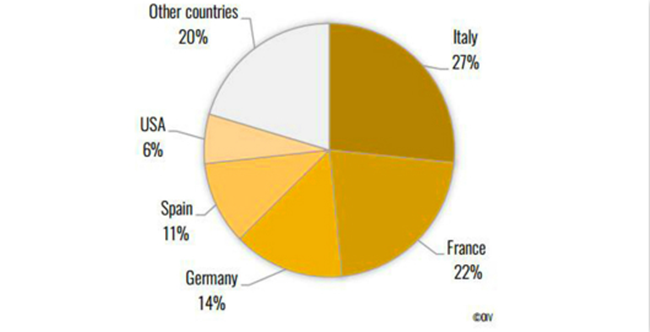 2018年全球主要起泡葡萄酒生產(chǎn)國:意大利(5.3億升)、法國(4.4億升)、德國(2.8億升)、西班牙(2.1億升)、美國(1.3億升)。2018年,全球近一半的產(chǎn)量來自意大利(27%)和法國(22%),前五大生產(chǎn)國占到了全球起泡葡萄酒產(chǎn)量的80%。