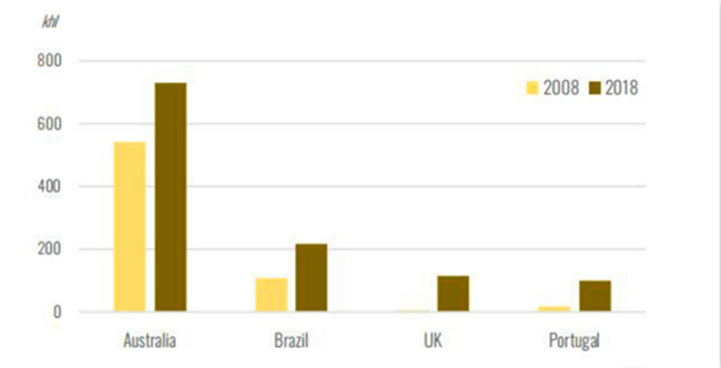 近年來,全球涌現(xiàn)出了很多新興起泡酒生產(chǎn)國,諸如英國(平均年度增長率33%)、葡萄牙(平均年度增長率18%)、巴西(平均年度增長率7%)、澳大利亞(平均年度增長率3%)。其中,英國的起泡酒產(chǎn)量占本國葡萄酒總產(chǎn)量的70%以上。