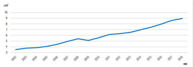 從本世紀(jì)初開始,全球起泡葡萄酒的消費(fèi)有了顯著增長。2009年-2010年期間,起泡酒的銷售曾受到了全球經(jīng)濟(jì)危機(jī)的影響。到2018年,全球起泡葡萄酒的消費(fèi)量達(dá)到了19億升,所占消費(fèi)份額增長至了8%。