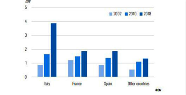自2016年,意大利一直是全球最大的起泡葡萄酒生產(chǎn)國。2018年起泡葡萄酒的產(chǎn)量為5.3億升,占意大利葡萄酒產(chǎn)量的10%。