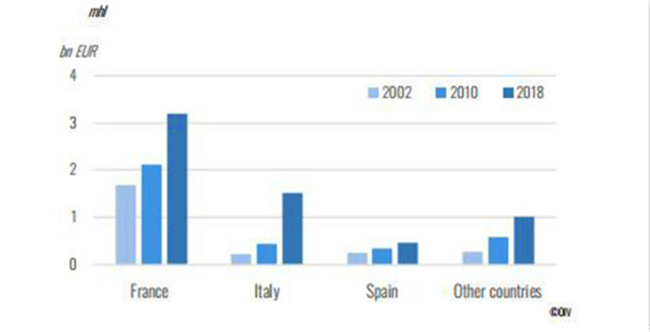 法國位列第二位,2018年起泡酒出口量為1.9億升,其中香檳占1.1億升。出口占總起泡酒總產(chǎn)量的43%。法國所占全球出口份額由2000年的33%降至了2018年的21%。主要出口市場有美國、英國、新加坡。出口值達(dá)30億歐元,占全球份額的52%。