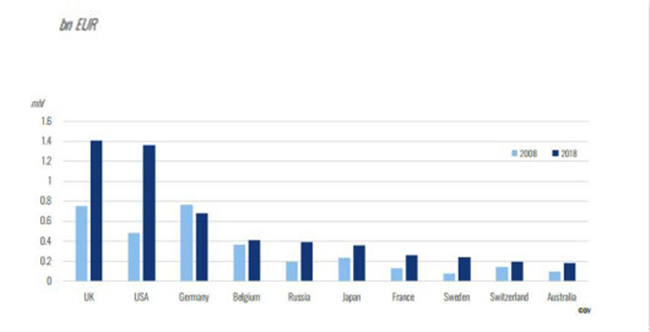 按價值計算,美國是最大的進(jìn)口國(11.12億歐元),其次是英國(7.23億歐元),日本(5.23億歐元),德國(4.25億歐元),新加坡(3.08億歐元)。自2008年,美國、日本市場有了顯著增長,年平均增長率分別為9%和7%。