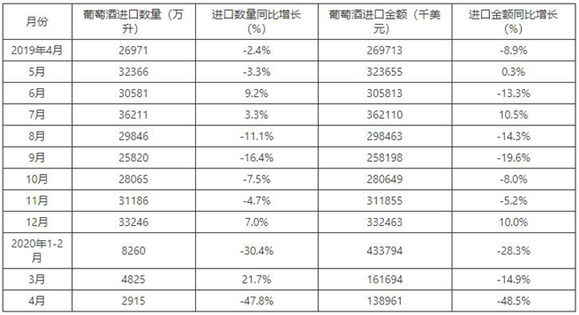 2015-2020年4月中國葡萄酒進(jìn)口數(shù)量及增速