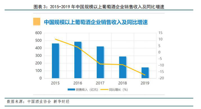 2019年,全國規(guī)模以上葡萄酒企業(yè)數(shù)量155家,銷售收入145.09億元,同比減少17.51%;實現(xiàn)利潤總額10.58億元,同比降低16.74%。2020年第一季度,銷售收入18.95億元,下降44.02%;利潤0.01億元,下降99.24%。全國葡萄酒行業(yè)規(guī)模以上企業(yè)經(jīng)濟(jì)效益在2019年本就低迷的情況下,受新冠肺炎疫情影響,在2020年第一季度顯得更加慘淡。