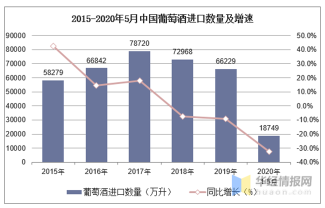2015-2020年5月中國葡萄酒進(jìn)口數(shù)量及增速