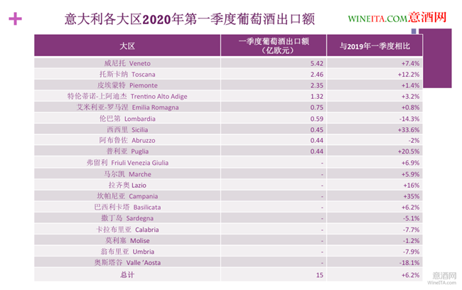 細分到各大區(qū),2020年第一季度葡萄酒出口額排名前三位的依次是威尼托大區(qū)(Veneto)、托斯卡納大區(qū)(Toscana)和皮埃蒙特大區(qū)(Piemonte)。