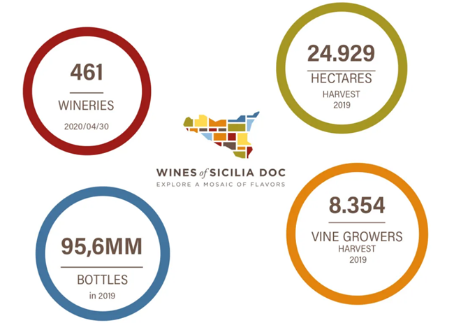2011年11月22日,西西里法定產(chǎn)區(qū)(SICILIA DOC)由意大利農(nóng)林部正式承認(rèn)通過(guò)。2019年,帶SICILIA DOC標(biāo)簽的有460多家酒莊,占約25,000公頃的葡萄園,8354位種植者,超9,500萬(wàn)瓶的裝瓶量。