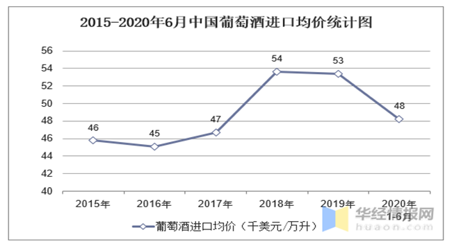 2015-2020年6月中國(guó)葡萄酒進(jìn)口均價(jià)統(tǒng)計(jì)圖