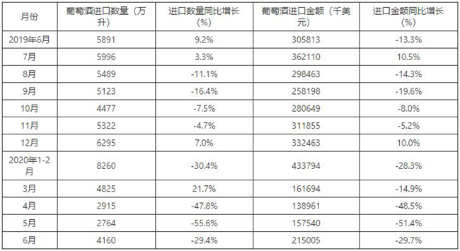 2015-2020年6月中國(guó)葡萄酒進(jìn)口數(shù)量及增速