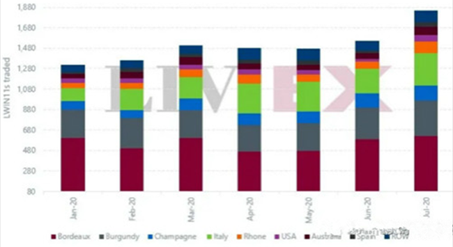 2020年上半年交易的獨立葡萄酒數(shù)量比2019年同期增長了37%。下半年初更加強勁,7月份交易的獨立葡萄酒數(shù)量(LWIN7)更首次突破1,000;并比之前最高月份高出超過20%(如下所示)。