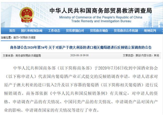 根據(jù)上述審查結(jié)果,依據(jù)《中華人民共和國(guó)反傾銷條例》第十六條的規(guī)定,商務(wù)部決定自2020年8月18日起對(duì)原產(chǎn)于澳大利亞的進(jìn)口相關(guān)葡萄酒進(jìn)行反傾銷立案調(diào)查?,F(xiàn)將有關(guān)事項(xiàng)公告如下: