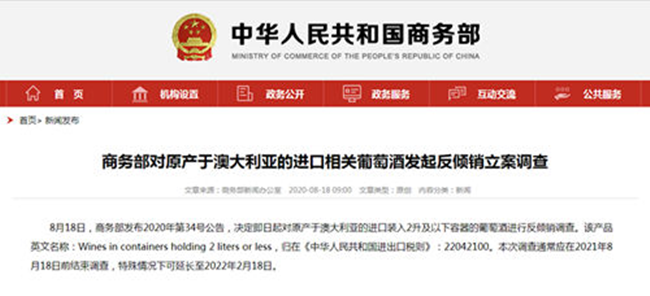 8月18日,商務(wù)部發(fā)布2020年第34號(hào)公告,決定即日起對(duì)原產(chǎn)于澳大利亞的進(jìn)口裝入2升及以下容器的葡萄酒進(jìn)行反傾銷調(diào)查。
