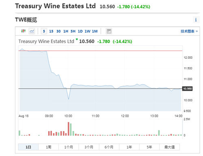 澳大利亞葡萄酒巨頭富邑葡萄酒集團(tuán)(Treasury Wine Estates)發(fā)表聲明稱,將配合中國(guó)相關(guān)部門新宣布的對(duì)澳大利亞向中國(guó)出口葡萄酒的反傾銷調(diào)查。但僅在該聲明發(fā)表后不久,該企業(yè)股價(jià)便迎來(lái)斷崖式下跌,盤中股價(jià)一度跌至10.050澳幣,截止收盤,報(bào)10.560澳幣,下跌14.42%。