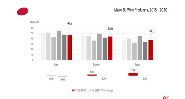 與2019年相比,意大利(47.2 mhl)下降了-1%,法國(guó)(43.9 mhl)小幅上升了4%,西班牙(37.5 mhl)大幅上升了11%以上。這三個(gè)國(guó)家的葡萄酒產(chǎn)量分別占世界葡萄酒產(chǎn)量的49%和歐盟葡萄酒產(chǎn)量的81%,當(dāng)前2020年的預(yù)計(jì)產(chǎn)量低于或略低于過(guò)去五年的平均水平。